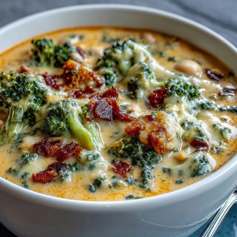 Save The magic of this soup lies in the blending. Once the broccoli, cannellini beans, and aromatic vegetables have simmered until tender, a quick pass with an immersion blender transforms everything into a silky, luscious base. Stirring in sharp cheddar cheese at the end adds a bold, savory depth that makes each bite deeply satisfying. Garnished with a little extra shredded cheddar or a few steamed broccoli florets, this soup is as beautiful to serve as it is delicious to eat.