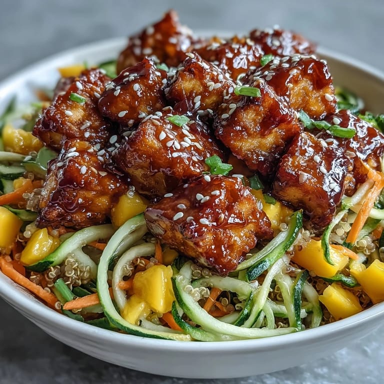 There's a rhythm to building a good bowl—you want textural contrast, flavor balance, and a sauce that ties everything together without drowning it. This recipe hits all three notes because the crispy protein stands up to the sauce, the soft mango provides sweetness, and the spiralized vegetables keep things light and fresh. The quinoa acts as an anchor, absorbing just enough sauce to flavor itself while staying fluffy underneath.