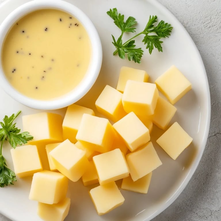Save A simple yet elegant cheese platter featuring creamy Gouda cubes paired with a tangy homemade mustard dip—perfect for entertaining or as a sophisticated snack.