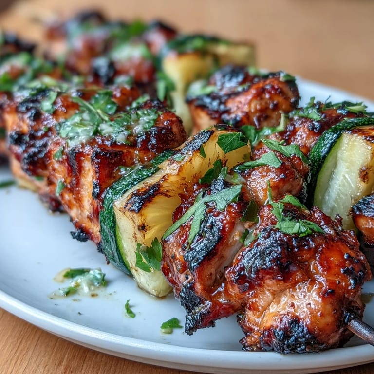 Save My neighbor brought over these skewers one summer evening, and I watched the honey-lime glaze caramelize under the grill flames—the smell alone made everyone gravitate toward the backyard. That night, I realized grilling didn't have to mean heavy or complicated; sometimes the best meals come together in an hour with ingredients you probably already have. The combination of juicy chicken, charred zucchini, and sweet pineapple felt tropical yet completely familiar, and I've been making them ever since.