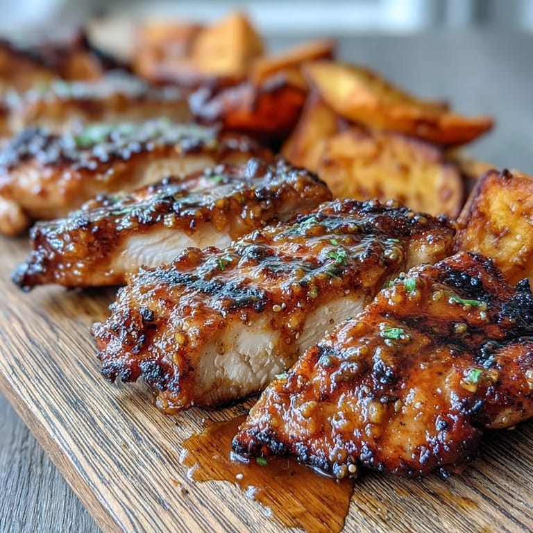 Save My neighbor knocked on the fence one summer evening with a bottle of wine and curiosity about what smelled so good on my grill. It was this honey mustard chicken, golden and glistening, paired with sweet potato wedges that had caramelized into something almost candy-like. She asked for the recipe right then and there, and I realized I'd stumbled onto something that felt both impressive and genuinely easy to pull off. The magic isn't in complicated technique—it's in that balance of tangy mustard, floral honey, and the slight char from the grill that brings everything alive.