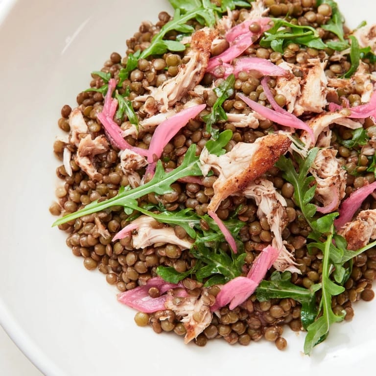 Save I stumbled onto this combination during that awkward shoulder season when winter vegetables feel tired and spring produce hasn't quite arrived yet. My grocery run had yielded a rotisserie chicken, a bag of arugula, and some lentils I'd been meaning to use for weeks. The mustard dressing came together on a whim when I realized I was out of my usual vinaigrette ingredients.
