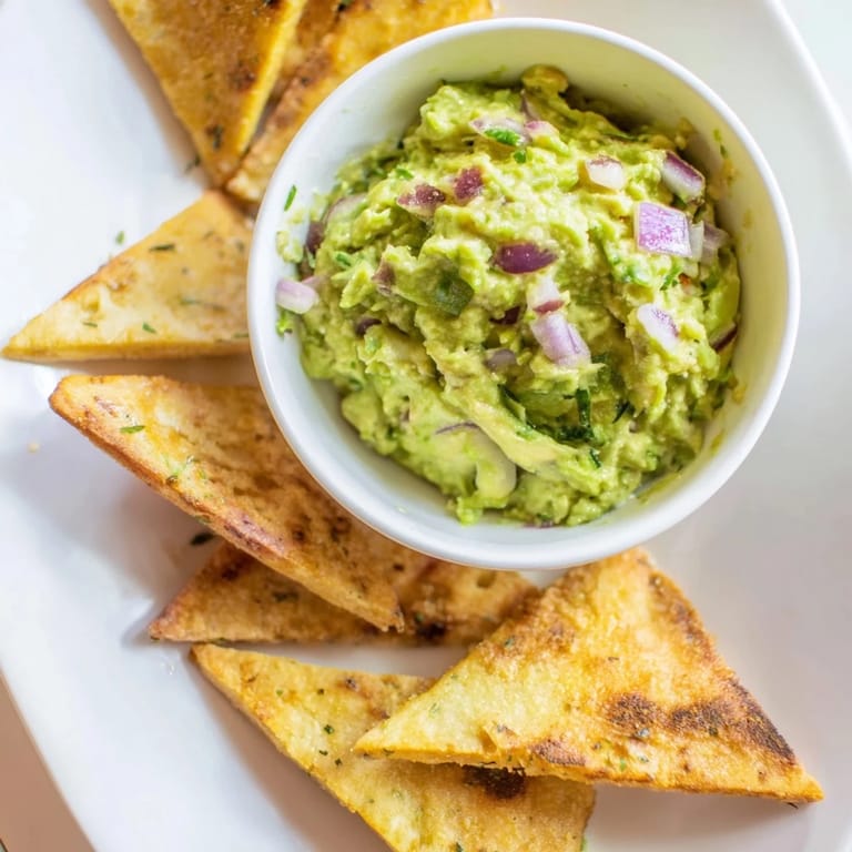 Save Crispy baked pita chips served with a creamy, zesty guacamole dip—perfect for parties or a savory snack.