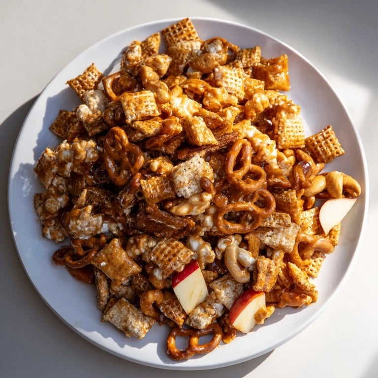 Save A festive, crunchy snack mix with a sweet apple-cider glaze, perfect for parties and holiday gatherings.