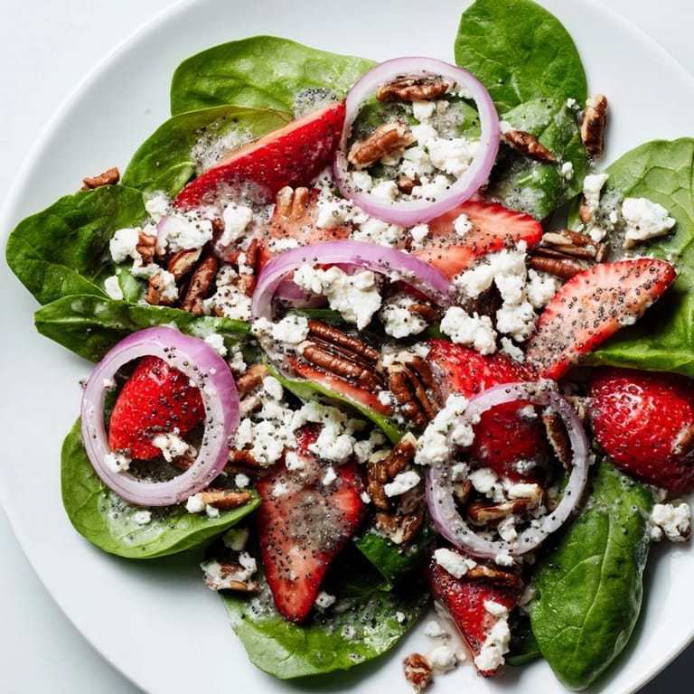 - In a large salad bowl, combine the spinach, strawberries, nuts, feta cheese, and red onion.