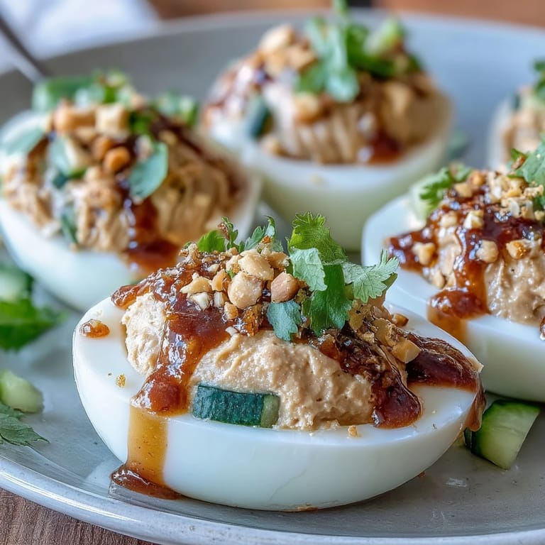 Save Cracking eggs on a quiet afternoon, the scent of peanut and fresh ginger began to mingle in my kitchen, promising something a little mischievous in these deviled eggs. Rather than relying on tradition, I found myself swept up by the idea of Thai flavors and a vibrant cucumber relish. It wasn’t a special occasion—just a craving for small bites brimming with contrast, both creamy and crisp. The whir of my food processor was joined by the pop of rice vinegar hitting cucumber, turning an old party favorite into something wholly new. Experiments like these always remind me there are no boring appetizers if you’re willing to play.